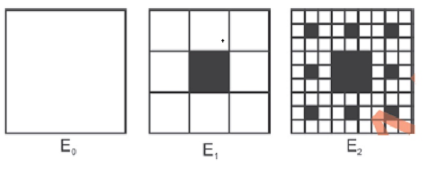 um fractal: os estágios 0, 1 e 2. O processo de elaboração do