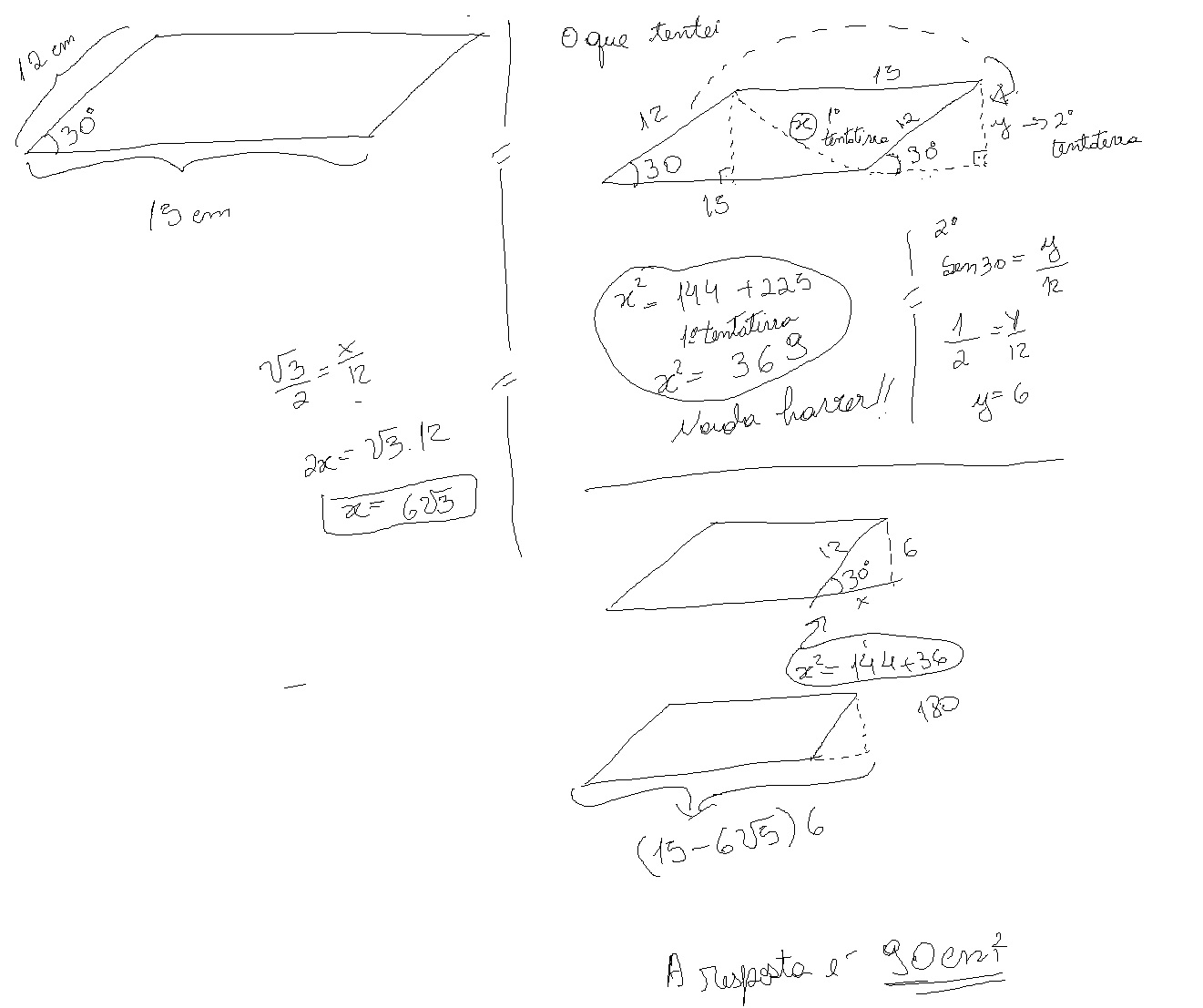 a questão pede para calcular a área de um paralelogramo de lado 12cm e base 15cm no encontro desses lados formam um angulo de 30 graus.