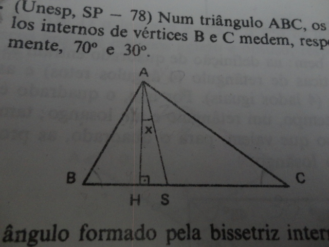 O ângulo formado pela bissetriz interna AS e a altura AH mede: