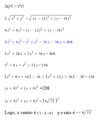 Uma cidade p está situada 12km ao leste e 18km ao norte da cidade q, como indicado na figura. Uma companhia telefônica quer posicionar uma torre retransmissora de modo que sua distância à cidade P seja o dobro da distância até a cidade Q.