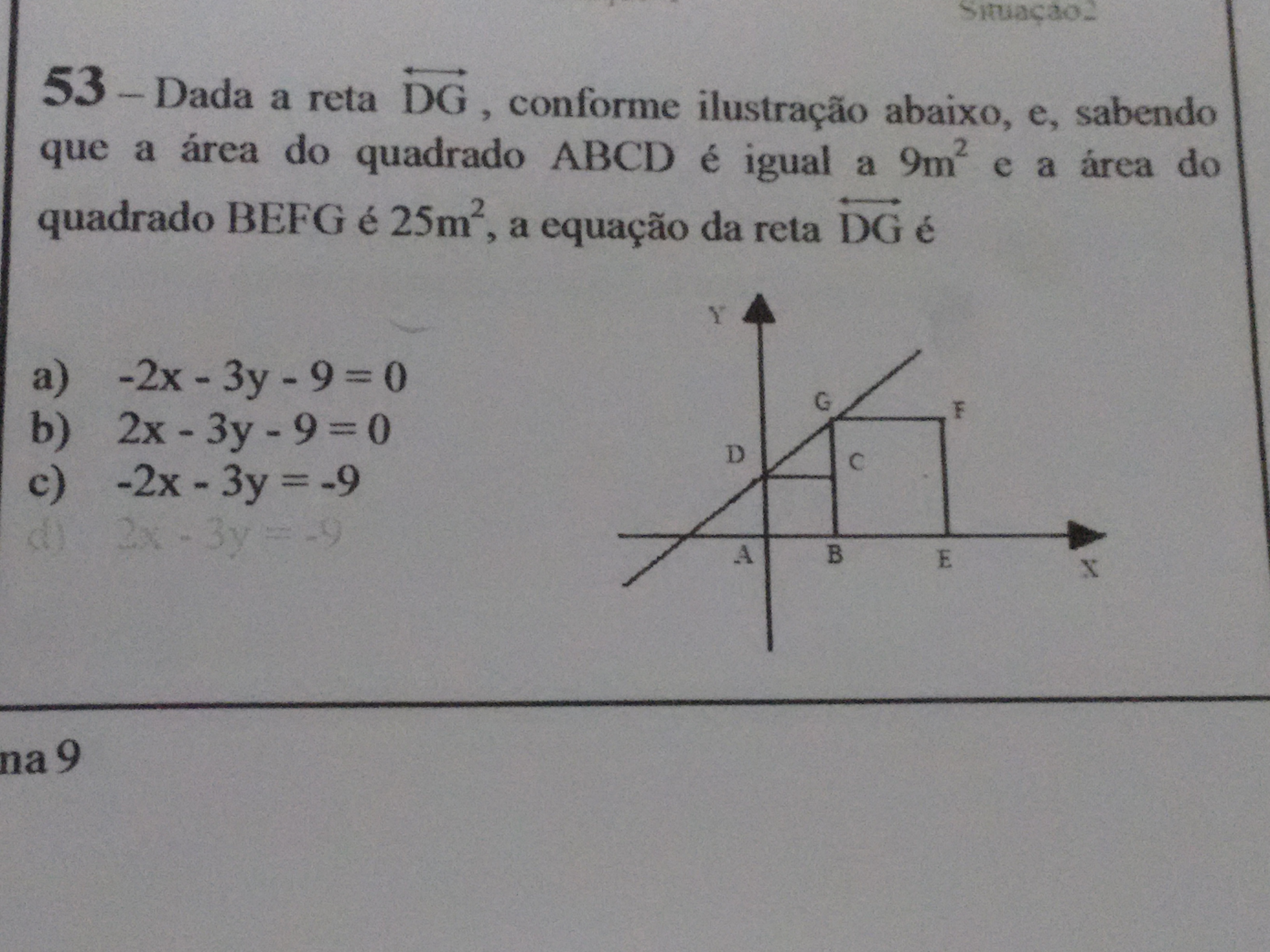 Equação da reta: y-yo = a.(x-xo) --> y-3=2/3.(x-0)--> y-3=2x/3 --> 3y-9=2x --> 2x-3y=-9
