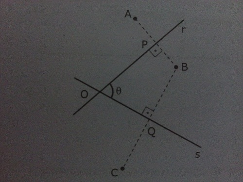 Nessa figura, os segmentos AB e BC são perpendiculares, respectivamente, às retas r e s. Além disso, AP = PB, BQ = QC e a medida do ângulo PÔQ é