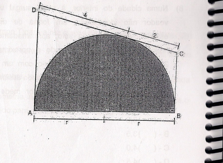 Trace, partindo de C, uma reta paralela a AB encontrando AD. O comprimento deste segmento é 2r. Se você tem o valor de AD e CB, os valores dos lados do triângulo formado ECD serão 6, (AD - CB) e 2r. Aplique pitágoras e encontrará r. Depois faça metade da área de uma circunferência.