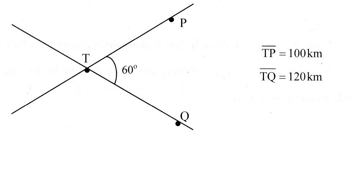 Duas estradas retas se encotram em um entroncamento T, formando um ângulo de 60°.Uma das estradas passa pela cidade P, que dista 100km de T e a outra passa pela cidade Q, que dista 120km de T, conforme ilustra a figura seguinte.Sabendo que no instante t=0 o carro A passa por P a 72km/h em direção a T, o carro B passa por Q a 96km/h também em direção a T, pede-se determinar, após exatamente 50 minutos: