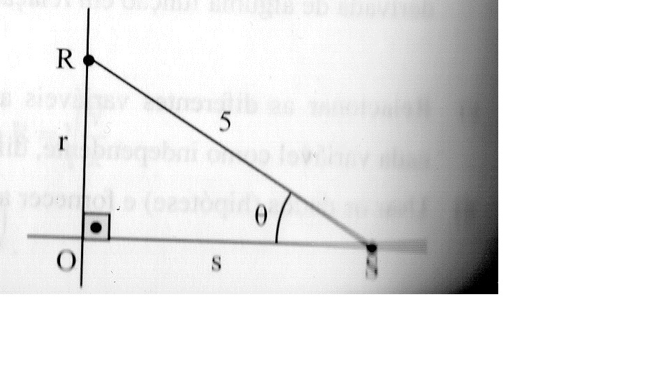 Uma barra de 5m de comprimento tem as suas extremidades R e S deslizando sobre os suportes de um ângulo reto de origem O. Se a extremidade R da barra aproxima-se da origem à razão constante de 3cm/min, determinar, no instante em que esta extremidade estiver a 4m da origem O: