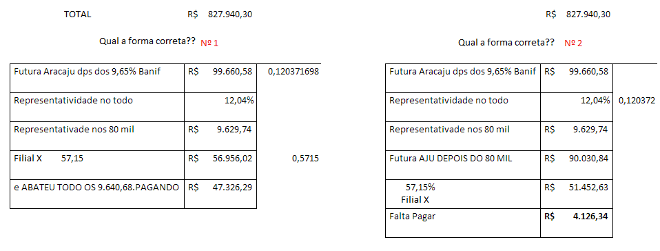 E a dúvida dele é qual dos dois estaria correto! No primeiro calculo ele descontou a representatividade da FILIAL X nos 80 mil reais, depois de calcular a comissão dela de 57,15%. No segundo ele descontou a representatividade da FILIAL X nos 80 mil reais antes de calcular a comissão dela de 57,15%.