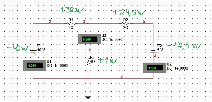 Então pessoal, consegui modelar o circuito a partir daquelas equações e aih está. Mas ainda há um problema, o exercício pede a potência total fornecida, o sentido das correntes estão corretos como pode ser visto nos amperímetros e conforme calculado anteriormente. Segundo a convenção passiva, se a corrente entrar pelo terminal negativo do elemento, este elemento estará fornecendo potência ao circuito, portanto a resposta seria 57.5 watts entretanto a resposta do gabarito é 22.5 Watts. E agora ???