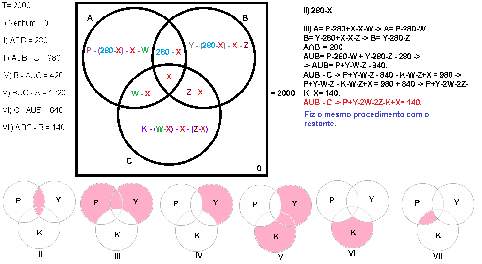 Então, resolvendo esse exercício , melhor dizendo, TENTANDO resolver, acabei não conseguindo e parti em busca do gabarito, que também está no anexo do exercício. A questão é, não concordei com a resolução, pois não sei se realmente está "errado" ou se eu -mais uma vez- me confundi na teoria. Por exemplo, quando o exercício "diz" que VI. 640 filiados votaram a favor de C, mas não de A ou de B, ele coloca os 640 todinho no C, e eu aprendi que esse valor não é somente os filiados que votaram em C, e sim está incluso os outros 2 (A e B). Do mesmo modo que em B. Segue outro anexo com o meu raciocínio. Nele, eu fiz à primeira vista, fiz também as hachuras de cada item, pois esse seria o meu outro raciocínio que vai de acordo com o gabarito, se eu realmente colocasse os respectivos valores em cada mancha. Resumindo meus dois raciocínios: 1° pensei que os valores dados não eram exclusivos para cada conjunto, e assim desenvolvi como segue no anexo. Já na 2° pensei baseado nas hachuras que fiz, e assim daria certo. Mas quero saber o porquê do 1° raciocínio não dar certo.