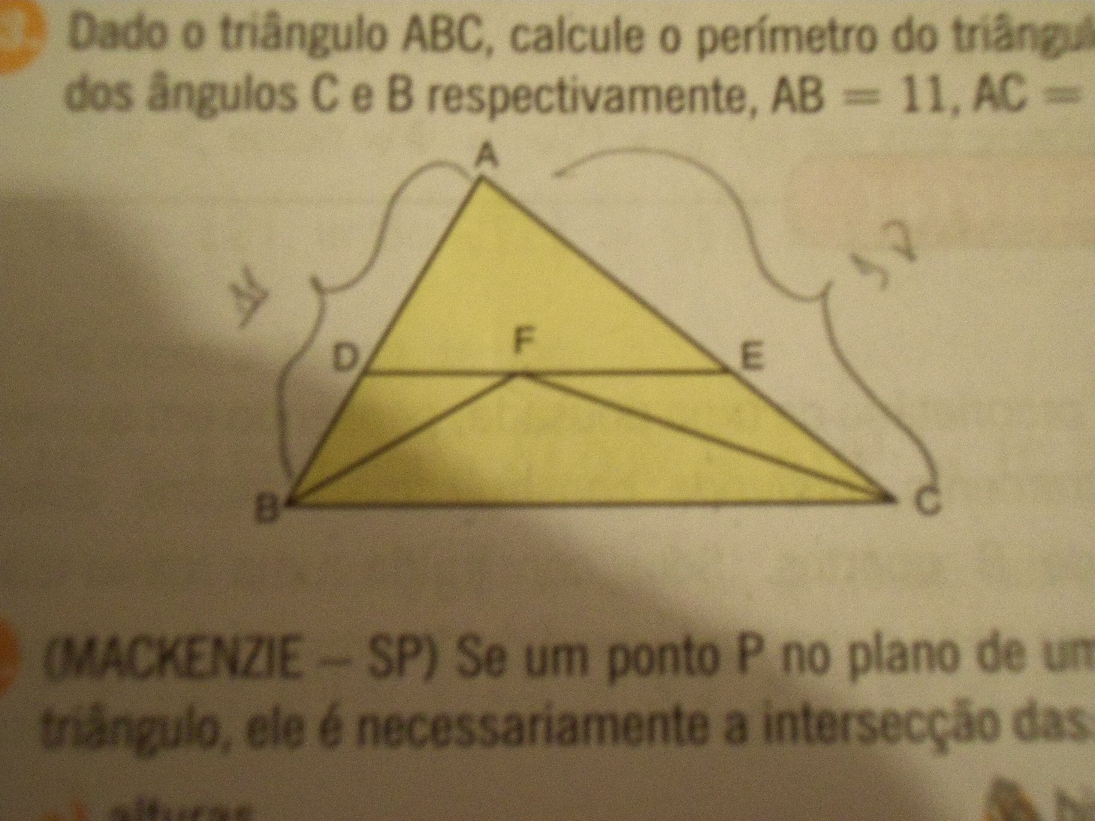 Dado o triângulo ABC, calcule o perímetro do triângulo ADE,sabendo que CF e BF são bissetrizes dos ângulos C e B respectivamente, AB=11, AC=18 e DE é paralelo a BC: