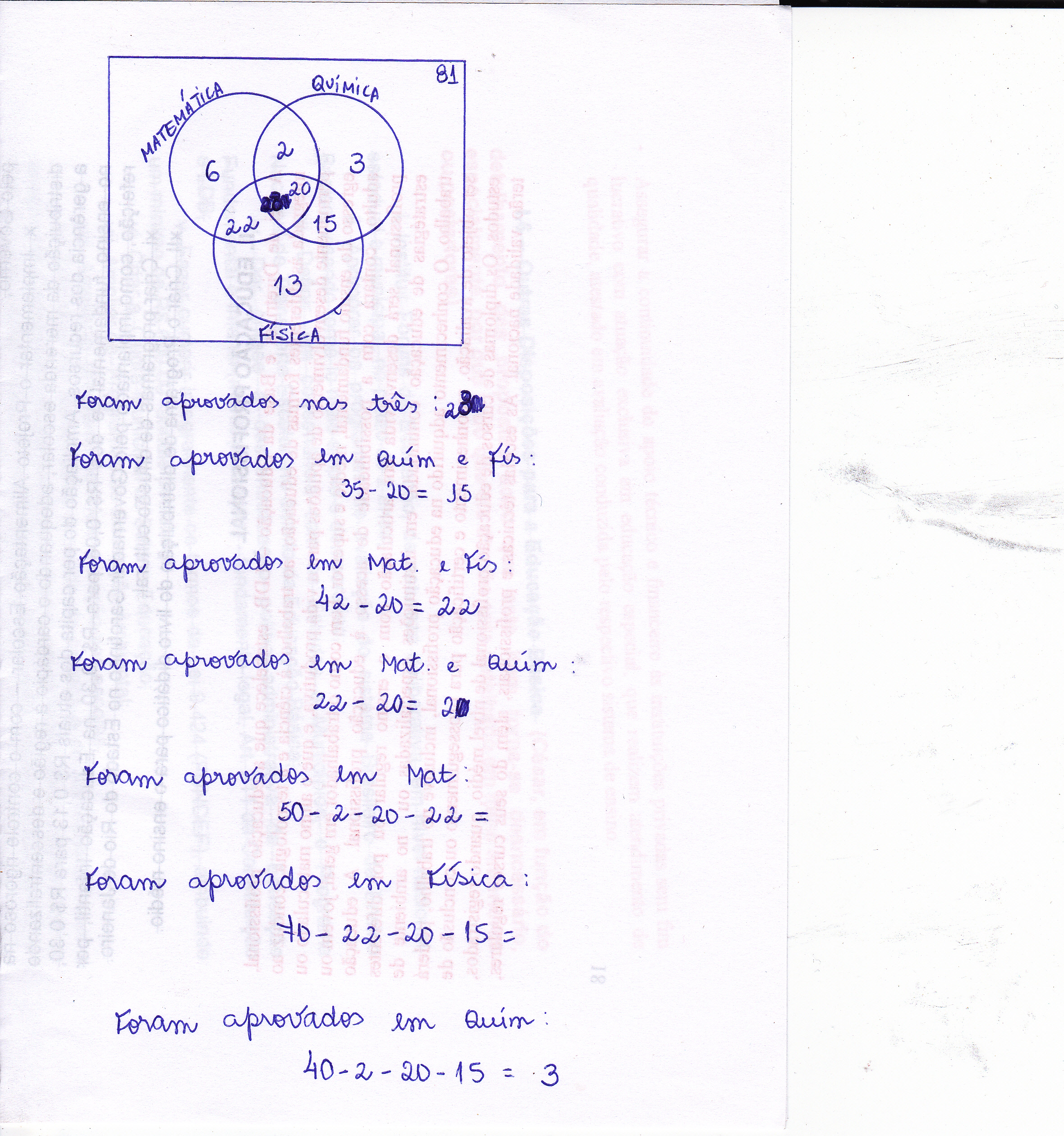 Já tentei resolver essa questão porém não consegui, eu montei 3 conjuntos interligados entre si, aonde os três se encontram coloquei 20, aonde QUIMICA e FISICA se encontram coloquei 35, onde MATEMATICA e FISICA se encontram coloquei 42 e onde QUIMICA e MATEMATICA se encontra coloquei 22, só que daí pra frente não consigo fazer, precisaria de uma resposta bem detalhada para que eu pudesse entender, sei que a resposta é 81(gabarito), mais não lembro como faz o calculo. Obrigado desde já pela ajuda!