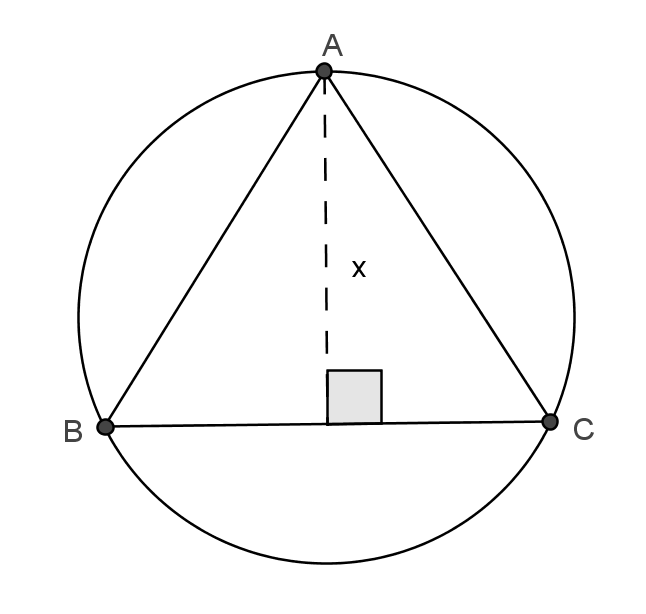 'Na figura tem-se um triângulo isósceles inscrito num círculo de raio 3 metros. Se x representa a medida, em metros, da altura do triângulo com relação à sua base, qual a área desse triângulo (em função de x), em metros quadrados?'