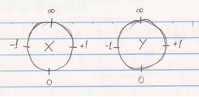 fica óbvio que para x=0 a função não é definida, pois quando x tende a 0 pela esquerda f(x) tende -?, ao passo que, pela dirieta, f(x) tende a +?. Enfim, dizemos que a função não é contínua em zero! No entanto, eu comecei a observar que tal função poderia ser contínua em zero sim, comecei a observar que ela poderia se conectar nos extremos, mas isto seria impossível de ocorrer no plano cartesiano, pois é baseado em duas retas ortogonais. Então eu idealizei uma superfície coordenada, onde os infinitos se conectam e os zeros também, formando pólos, ficando compreendido o infinito dentro de um certo intervalo assim como compreendemos o infinitesimal entre 1 e 0 *.Então os eixos não são mais retas e sim curvas, mas ainda sendo elementos unidimensionais: