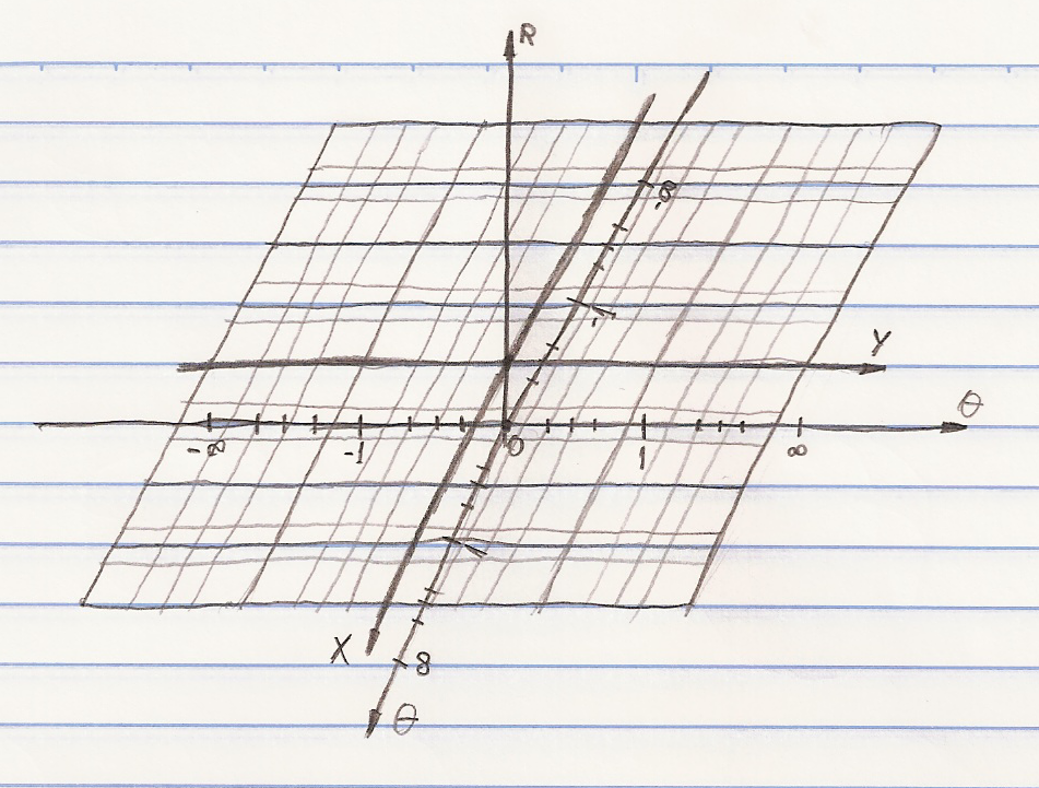 E eu pensei numa forma de ratificar essa superfície esférica também, tomando o raio da esfera em função dos dois ângulos que ela possui, isso gera uma superfície quadrada: o plano onde podemos identificar os eixos x e y como retas, assim: