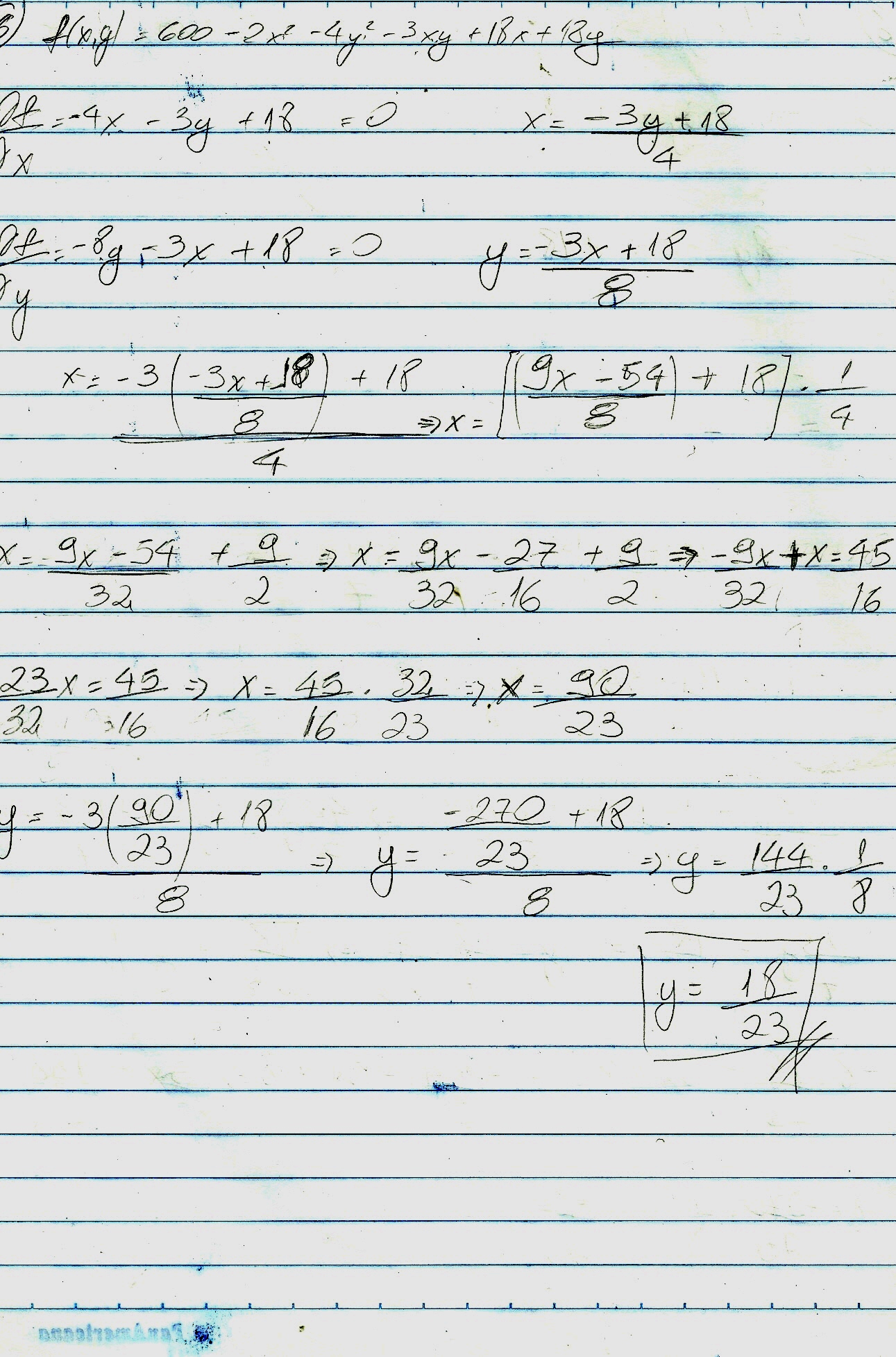 O lucro que uma empresa obtém, vendendo dois tipos de produtos A e B, é dado por f(x,y)= 600 - 2x² - 4y² - 3xy - 2x² - 2,5y² , em que x e y são as quantidades vendidas.Obtenha os valores de x e y que maximizam o lucro.