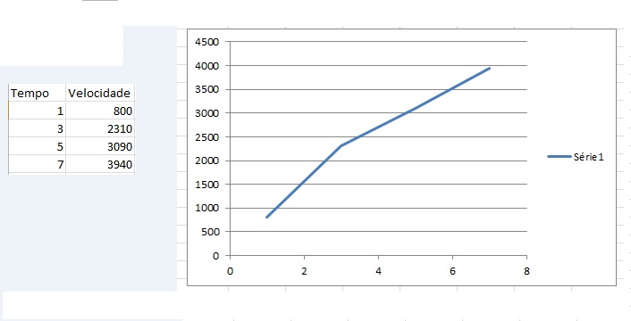 mas, quando preenchi os "buracos" da primeira tabela com os tempos que faltavam (4 segundos, 6 segundos), usando a equação geral da reta, obtive outro gráfico diferente: