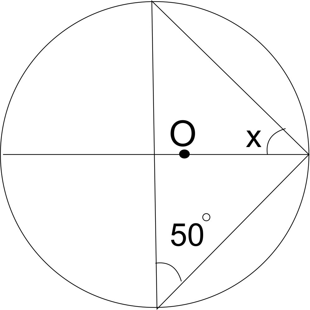 o arco na circunferencia corresponde ao angulo inscrito de de 50,eh 100...do ponto oposto ao angulo de 50 ao ponto de encontro com reta q. contem o centro o,sera de 80...logo...2x=80...x=40